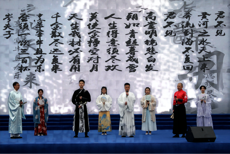 青物書院為搞好此次活動,確保節(jié)目精益求精,組織集團系統(tǒng)職工高凱、郭宇、阿柏林、任蕊、王思涵等8名員工排練了富有特色的詩樂鳴響《將進酒》。在演出現(xiàn)場,悠揚婉轉的古箏配上鏗鏘有力的誦讀,將詩仙李白的傳統(tǒng)經典賦予了新的形式,煥發(fā)出新的光彩,將活動現(xiàn)場推向了高潮,現(xiàn)場掌聲雷動,展現(xiàn)出了青海物產集團職工奮發(fā)向上的精神風貌,塑造了青海物產書香企業(yè)的良好形象。