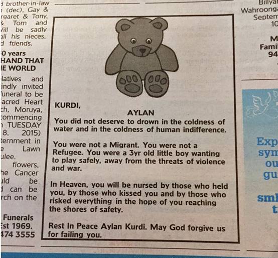 在澳大利亞,還有人在9月4日的《悉尼先驅(qū)晨報》上為小Aylan發(fā)了份訃告。