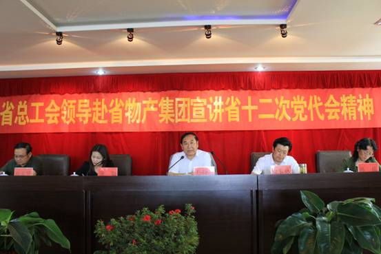 7月2日下午,省總工會巡視員、經(jīng)費審查委員會主任劉西昆、經(jīng)審辦蒲勤主任、女工部韓梅部長、重工機械輕紡工會白立賢副主席一行4人來物產(chǎn)集團宣講省十二次黨代會精神。集團黨委書記、工會主席白家林同志主持宣講報告會,集團兩級工會主席、委員40余人參加宣講報告會。
