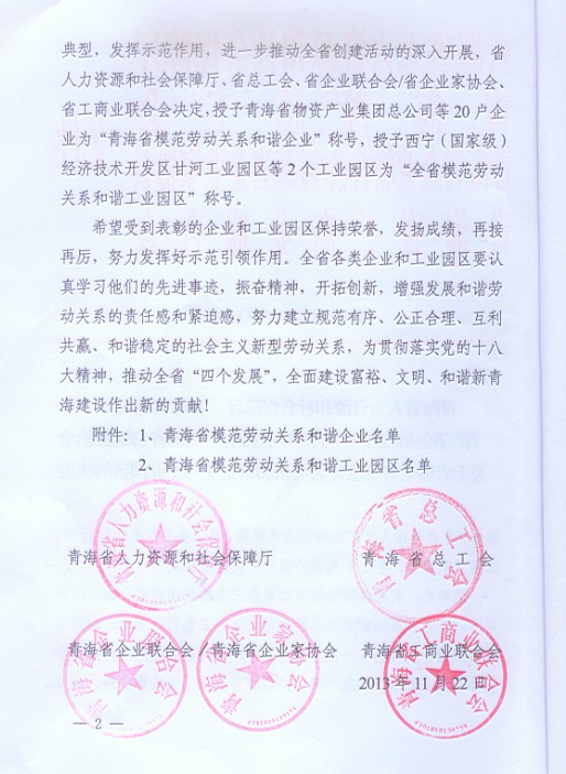 青海省物產(chǎn)集團總公司榮獲“青海省模范勞動關系和諧企業(yè)”稱號
