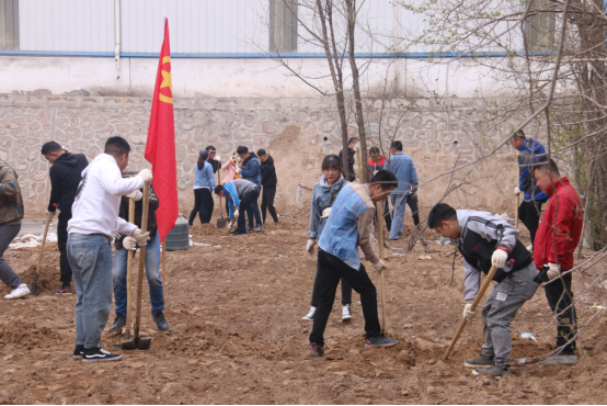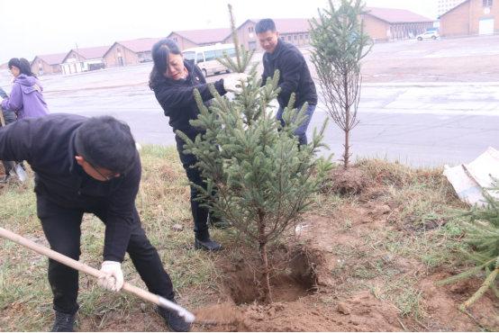 在園區(qū)內(nèi),大家興致勃勃,干勁十足,有的揮鍬挖坑、有的搬運樹苗、有的扶苗培土、有的提水澆灌,經(jīng)過3個小時的忙碌,100棵松柏昂然挺立,呈現(xiàn)出一派生機(jī)勃勃的景象。