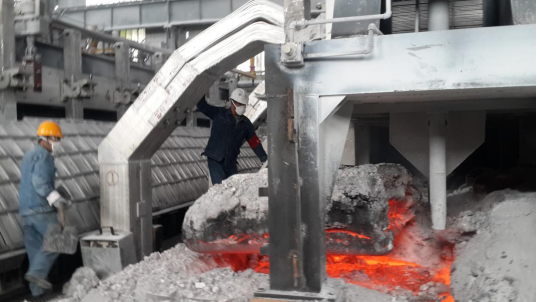 待多功能天車將殘極調(diào)出,趙德福高溫下的"高溫作業(yè)"才算正式開始。因為殘極調(diào)出后裸露出火紅的、溫度高達900多攝氏度的爐膛。趙德福用大勾、大耙等工具將大小不一的殘極塊一一撈出,確認爐膛干凈后,指揮多功能天車裝入新陽極,張壽昌、劉強負責添加保溫料、殼面整形等。